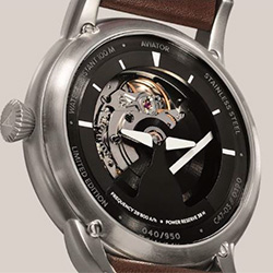 Корпус состоит из трех эквивалентных частей: ободка, корпусного кольца и задней крышки корпуса. Ручная обработка при помощи изящных часовых технологий, закругленные формы – все это напоминает лоснящуюся элегантность фюзеляжа самолета Douglas. Его великолепная зеркальная полировка прекрасно сочетается с эргономичными обтекаемыми линиями. А изогнутые лапки корпуса – образец элегантности прошлых лет – гарантированно хорошо лежат по руке любого размера. Как и для всех часов AVIATOR, требуется сделать более 40 операций, чтобы произвести корпус, отвечающий высоким требованиям.