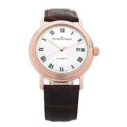 Циферблат – серебристый, guilloché, золотые стрелки, чёрные римские (I-XII) цифры, окошко даты. Водонепроницаемость 3 атм. (30 м). Коричневый кожаный ремешок.