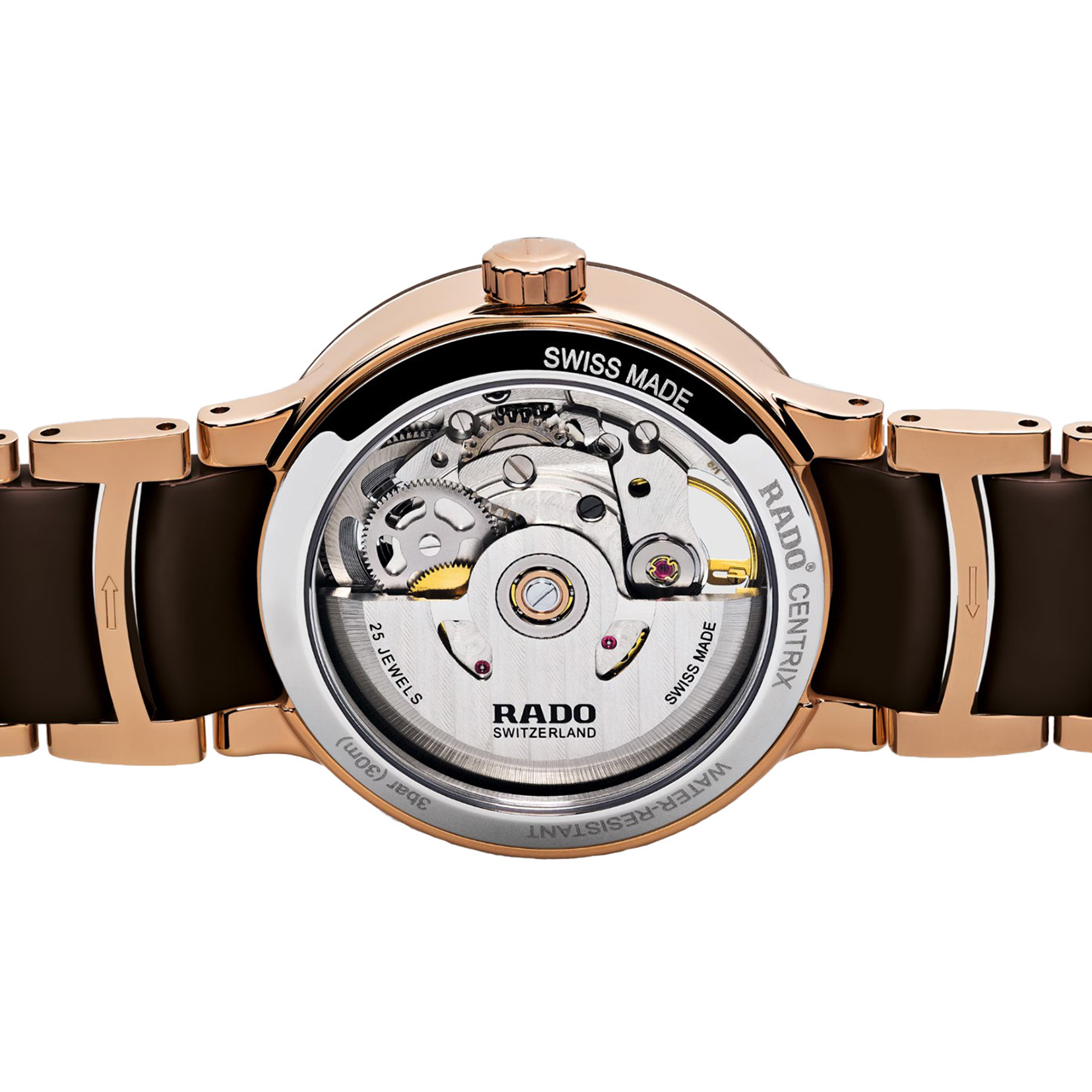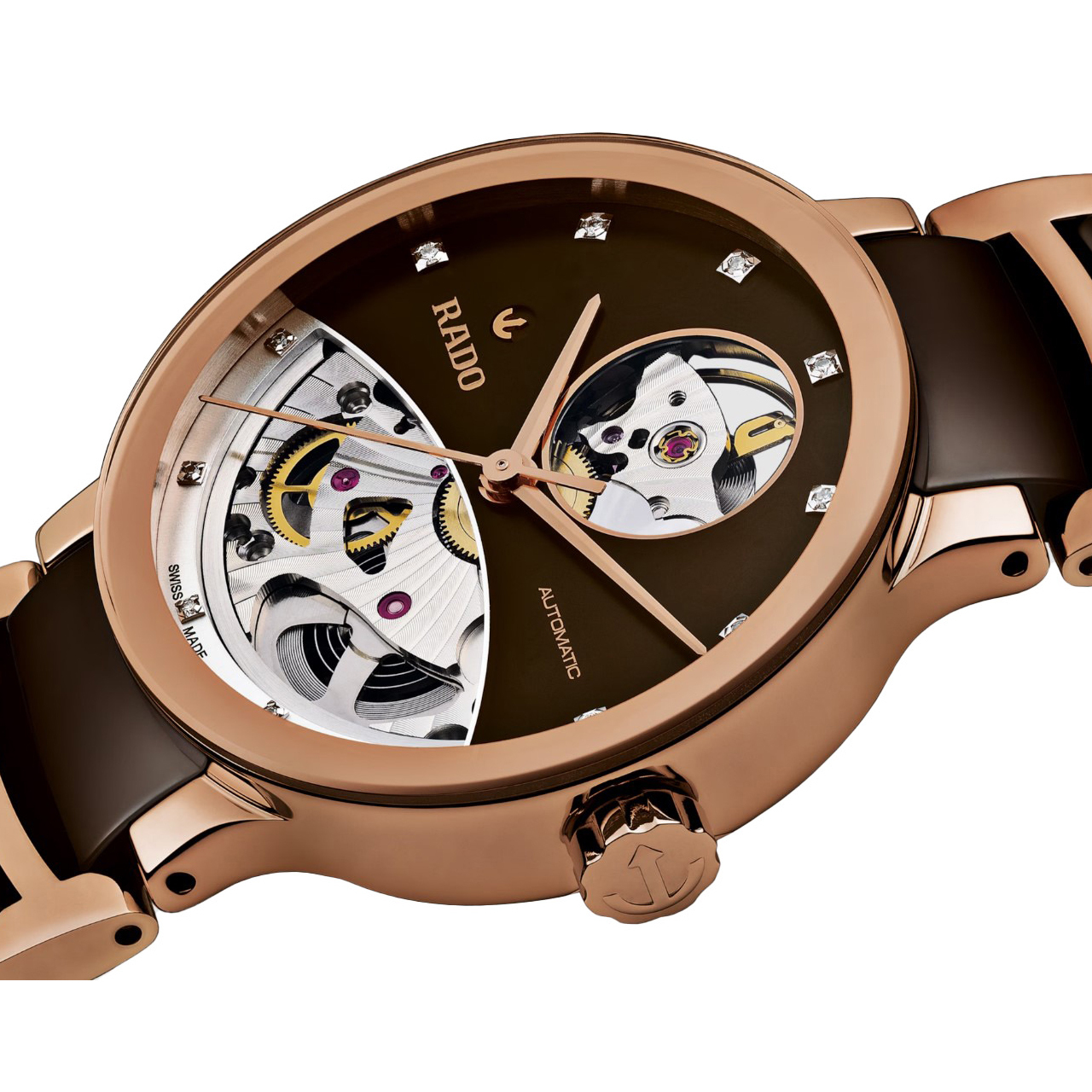 Корпус: Нержавеющая сталь/вакуумное напыление. Крышка корпуса из прозрачного сапфира. Диаметр 33 мм. Водонепроницаемость 30 метров. Циферблат коричневый, скелетированный. 7 diamonds, 0,027 carat, 5 diamonds, 0,010 carat.