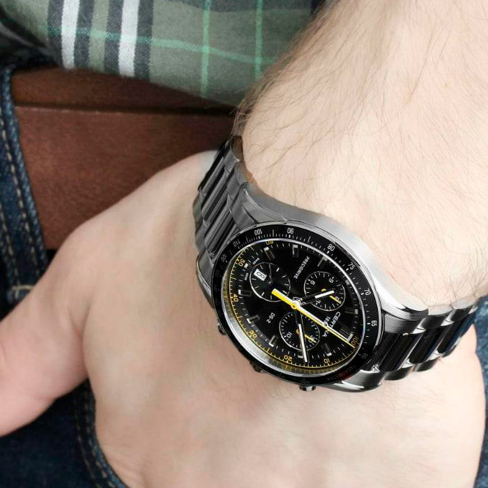 Корпус: Нержавеющая сталь. Безель с PVD - покрытием чёрного цвета. Чёрный циферблат с серебристыми стрелками и рисками. Люминесцентное покрытие часовой и минутной стрелок. Сапфировое стекло с антибликовым покрытием. Диаметр 41 мм. Водостойкость 100 м. Система DS.