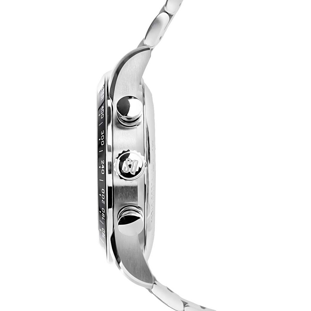 Функции: Индикация часов, минут при помощи центральных стрелок. Хронограф с 12-ти часовым, 60-ти секундным и 30-ти минутным счетчиками, индикация даты и вынесенная секундная стрелка на "6 часов". Тахиметрическая шкала.