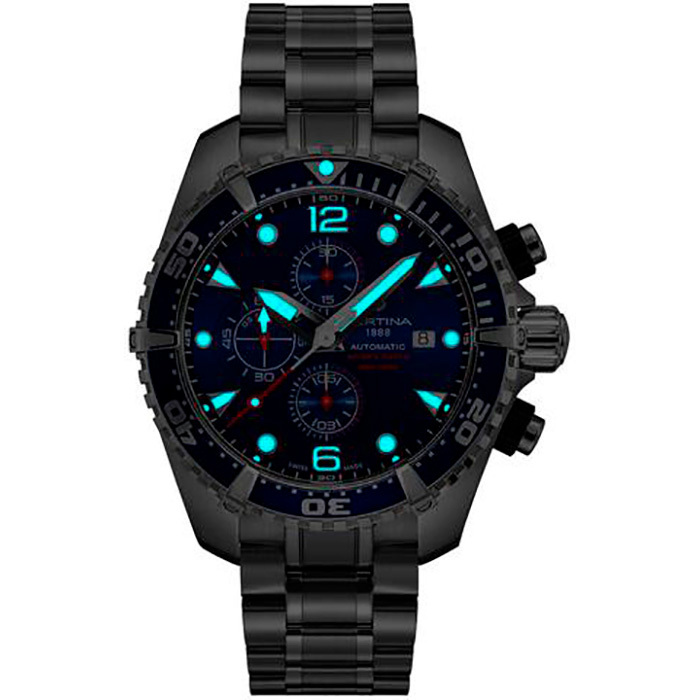 Корпус: Корпус из нержавеющей полированной/матовой стали. Вращающийся в одном направлении безель с 60 - минутной шкалой на полированном синем кольце. Синий циферблат. Стрелки и часовые индексы серебристого цвета с люминесцентным покрытием. Завинчивающаяся заводная коронка. Сапфировое стекло с антибликовым покрытием. Диаметр 46 мм. Водостойкость 300 м. Система DS.