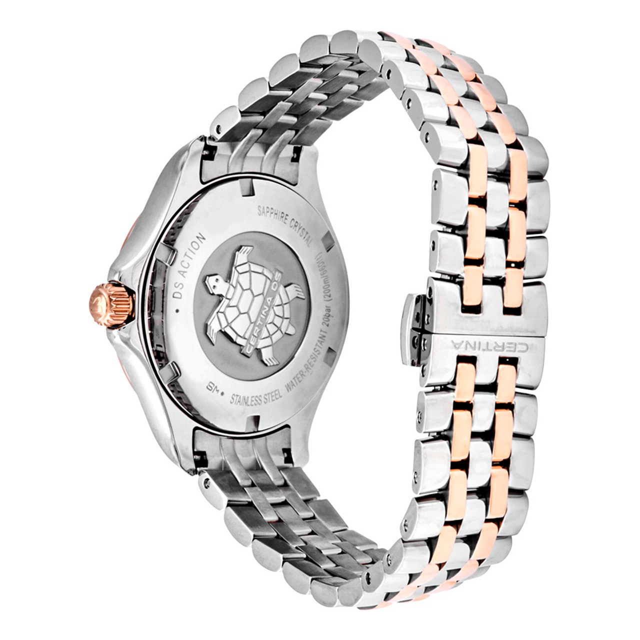 Корпус: Корпус из нержавеющей полированной/матовой стали, безель с PVD - покрытием розового цвета. Металлик циферблат украшен тримя бриллиантами. Стрелки и риски золотистого цвета. Сапфировое стекло с антибликовым покрытием. Диаметр 34 мм. Водостойкость 100 м. Система DS.