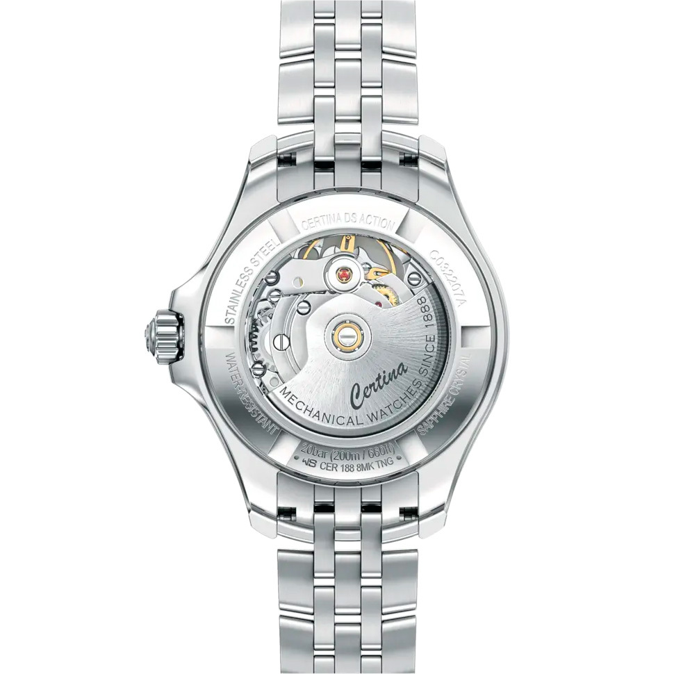 Корпус: Корпус модели выполнен из высококачественной стали марки 316L с повышенной устойчивостью к коррозии, поверхности с матовой шлифовкой – сатинированием и полировкой до зеркального блеска. Чёрный циферблат украшен 8 бриллиантами цвета Top Wesselton. Одностороннее антибликовое покрытие сапфирового стекла. Прозрачная задняя крышка. Диаметр: 34,5 мм. Водостойкость: 200 м.