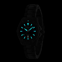 Корпус: Нержавеющая сталь. Синий циферблат. Стрелки и часовые индексы серебристого цвета, покрыты люминесцентным составом. Сапфировое стекло. Диаметр 34 мм. Водозащита 300 м.