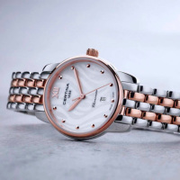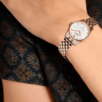 Корпус: Корпус из полированной/матовой нержавеющей стали с частичным PVD - покрытием. Антибликовое покрытие сапфирового стекла. Перламутровый цифербла с узором. Водостойкость: 100 м. Диаметр: 27,5 мм.