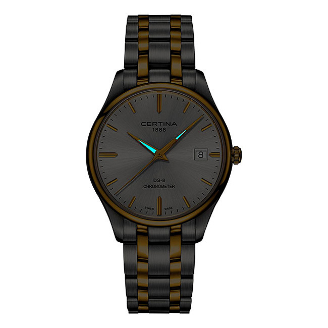 Корпус: Для корпуса часов марка Certina использует нержавеющую сталь 316L, отличающуюся повышенной износостойкостью, устойчивостью к коррозии с частичным PVD - покрытием, поверхности с матовой шлифовкой – сатинированием и полировкой до зеркального блеска. Серебристый циферблат выполнен по технологии Sunray (солнечные лучи). Мечевидные стрелки в стиле Sword с покрытием SuperLumiNova, которое обеспечивает подсветку циферблата с темное время суток даже после кратковременного воздействия света. Сапфировое стекло с односторонним антибликовым покрытием устойчивое к возникновению царапин. Рифленая заводная головка. Диаметр корпуса составляет: 40,2 мм, толщина 11,55 мм. Водостойкость: WR 100.