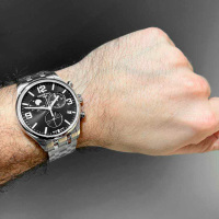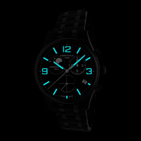 Функции: Индикация часов, минут при помощи центральных стрелок. Хронограф, малая секундная стрелка в положении 6 часов, окошко даты в положении 4 часа, индикация фазы луны в положении 10 часов.