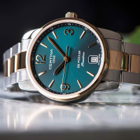 Корпус: Корпус из полированной/матовой нержавеющей стали с PVD - покрытием золотом. Зеленый циферблат с золотистыми стрелками и часовыми индексами. Сапфировое стекло. Диаметр 33 мм. Водостойкость 100 м. Система DS.