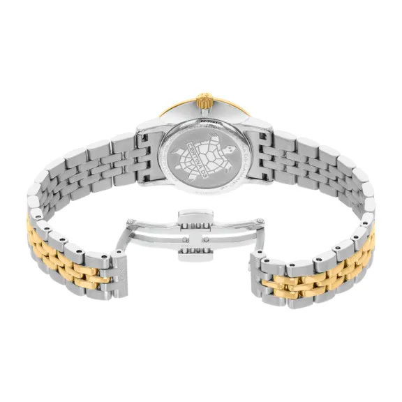 Корпус: Корпус из полированной/матовой нержавеющей стали с частичным PVD - покрытием жёлтого цвета. Металлик циферблат, золотистые стрелки и часовые индексы с люминесцентным покрытием. Сапфировое стекло. Диаметр 28 мм. Водостойкость 100 м. Система DS.