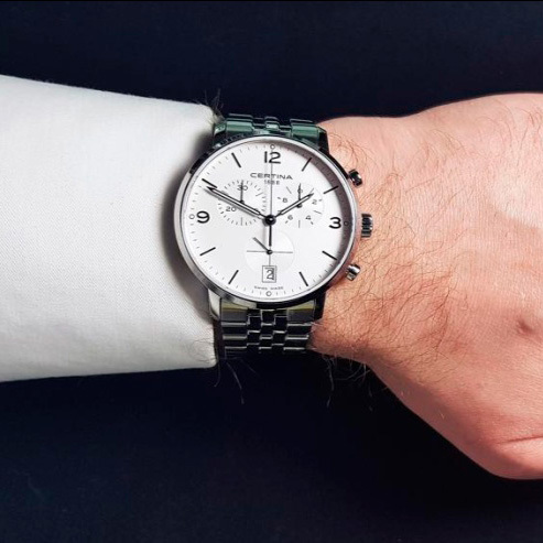 Функции: Индикация часов, минут при помощи центральных стрелок. Маленькая, отдельно вынесенная секундная стрелка. Дата в положении "6 часов". Хронограф.
