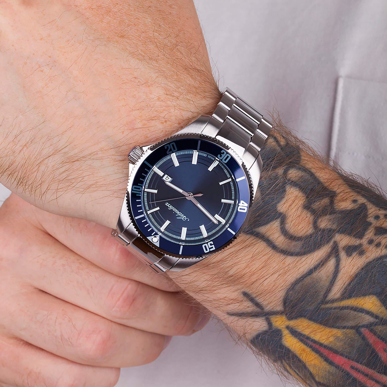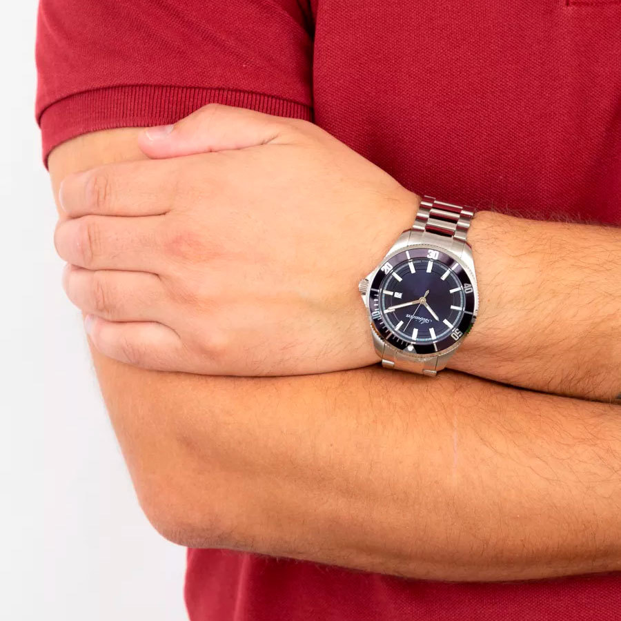 Корпус: Круглый корпус выполнен из полированной нержавеющей стали. Синий циферблат. Накладные часовые индексы выполнены из стали. Стрелки с покрытием SuperLuminova, которое обеспечивает подсветку в темное время суток. Минеральное стекло. Рифленая заводная головка. Диаметр корпуса составляет 46 мм, толщина 12 мм. Водостойкость WR 50 (мытье рук, дождь).