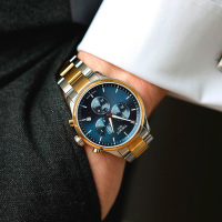 Корпус: Корпус выполнен из высококачественной стали 316L с частичным жёлтым PVD покрытием золотом. Синий циферблат выполнен по технологии Sunray (солнечные лучи). Метки в виде арабских цифр. Люминесцентная подсветка часовой и секундной стрелок. Сапфировое стекло. Рифленая заводная головка. Диаметр корпуса 45 мм. Водозащита 100 метров.