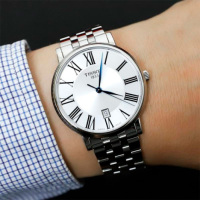 Корпус: Корпус выполнен из высококачественной стали с повышенной устойчивостью к коррозии, поверхности полировкой до зеркального блеска. Циферблат выполнен по технологии Sunray (солнечные лучи) с логотипом Tissot. Узкие листовидные стрелки в стиле Feuille синего цвета и часовые индексы в виде римских цифр чёрного цвета. Сапфировое стекло с антибликовым покрытием, устойчивое к появлению царапин, обладающее высокой прозрачностью. Рифленая заводная головка с логотипом. Диаметр корпуса составляет 40 мм. Водонепроницаемость: 50 м.