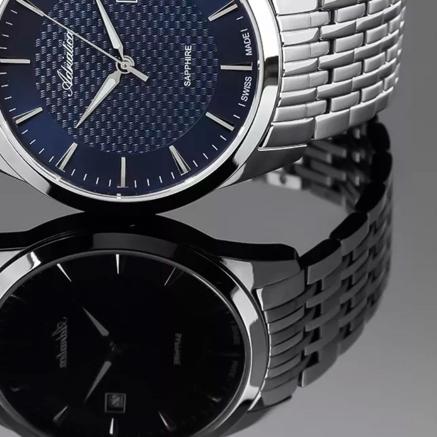 Корпус: Круглый корпус выполнен из полированной нержавеющей стали. Синий циферблат с узором гильоше. Накладные часовые индексы выполненый из стали. Стрелки с покрытием SuperLuminova, которое обеспечивает длительную подсветку в темное время суток. Устойчивое к возникновению царапин сапфировое стекло. Диаметр корпуса составляет 40 мм, толщина 7 мм. Водостойкость WR 50 (мытье рук, дождь).