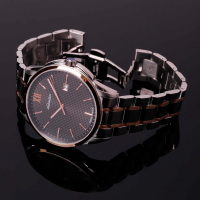 Корпус: Круглый корпус выполнен из полированной нержавеющей стали с частичным PVD покрытием розового золота. Чёрный циферблат с узором гильоше. Метки в виде штрихов и римской цифры 12. Стрелки с покрытием SuperLuminova, которое обеспечивает длительную подсветку в темное время суток. Устойчивое к возникновению царапин и потертостей сапфировое стекло. Заводная головка с защитой. Диаметр корпуса составляет 45 мм, толщина 9 мм. Водостойкость WR 50 (мытье рук, дождь).