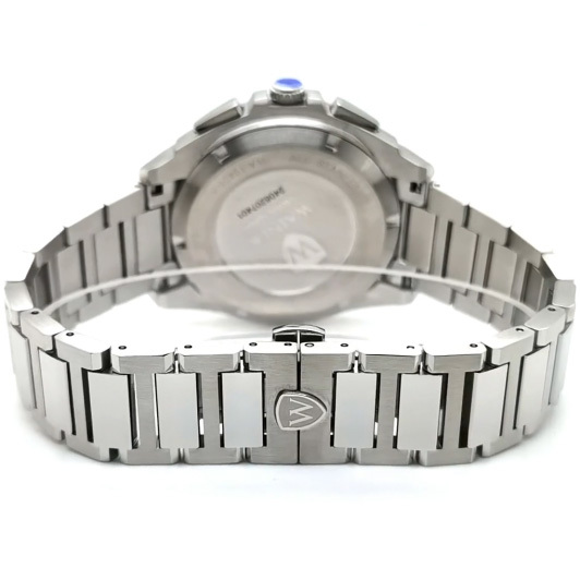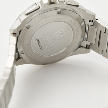 Корпус: Круглый корпус из нержавеющей стали 316L с матовой и полированной отделкой. Синий циферблат украшен декоративным узором в виде горизонтальных линий и фирменным логотипом Wainer. Циферблат защищен прочным сапфировым стеклом. Накладные метки в виде штрихов. Люминесцентные стрелки. Рифленая заводная головка с защитой. Диаметр корпуса 43 мм. Водонепроницаемость 50 метров.