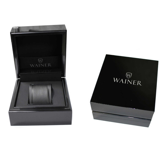 Корпус: Круглый корпус из нержавеющей стали 316L с частичным PVD покрытием. Зелёный циферблат украшен декоративным узором в виде горизонтальных линий и фирменным логотипом Wainer. Циферблат защищен прочным сапфировым стеклом. Накладные метки в виде штрихов. Люминесцентные стрелки. Рифленая заводная головка с защитой. Диаметр корпуса 43 мм. Водонепроницаемость 50 метров.