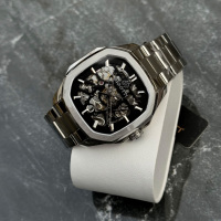 Корпус: Корпус изготовлен из латуни и имеет надёжное износостойкое покрытие серебристого цвета. Циферблат чёрного цвета (частично скелетон). Стальные часовые индексы и стрелки. Прочное минеральное стекло обеспечит защиту часов от повреждений. Диаметр: 42 мм. Водонепроницаемость: 50 м.