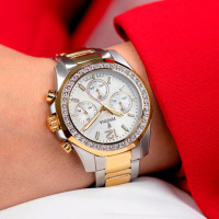 Корпус: Ударопрочный корпус часов сделан из нержавеющей стали с частичным жёлтым PVD. Перламутровый циферблат с золотистыми стрелками и часовыми индексами в виде точек. Корпус и циферблат украшены кристаллами. Минеральное стекло. Рифленая заводная головка. Диаметр: 38 мм. Водонепроницаемость: 100 м.