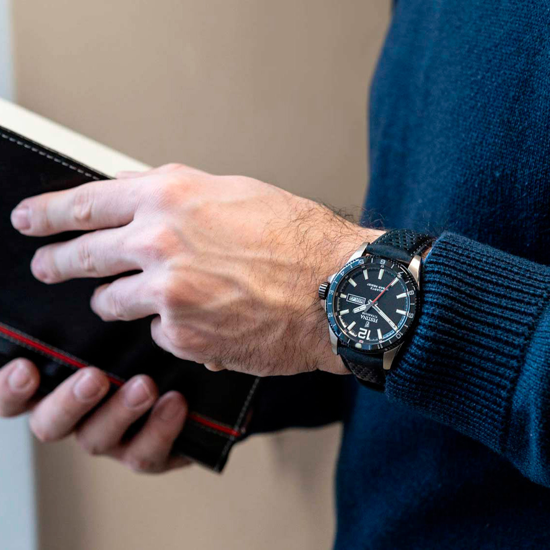 Корпус: Круглый титановый корпус с частичным PVD покрытием. Безель с часовыми метками. Циферблат выполнен по технологии Sunray (солнечные лучи). Метки в виде штрихов и арабской цифры 12. Минеральное стекло более устойчиво к появлению небольших царапин и потертостей, хорошо может выдержать небольшие удары и падения. Стрелки с люминесцентным покрытием. Рифленая заводная головка с защитой. Завинчивающаяся задняя крышка. Диаметр 43 мм. Водонепроницаемость 100 м.