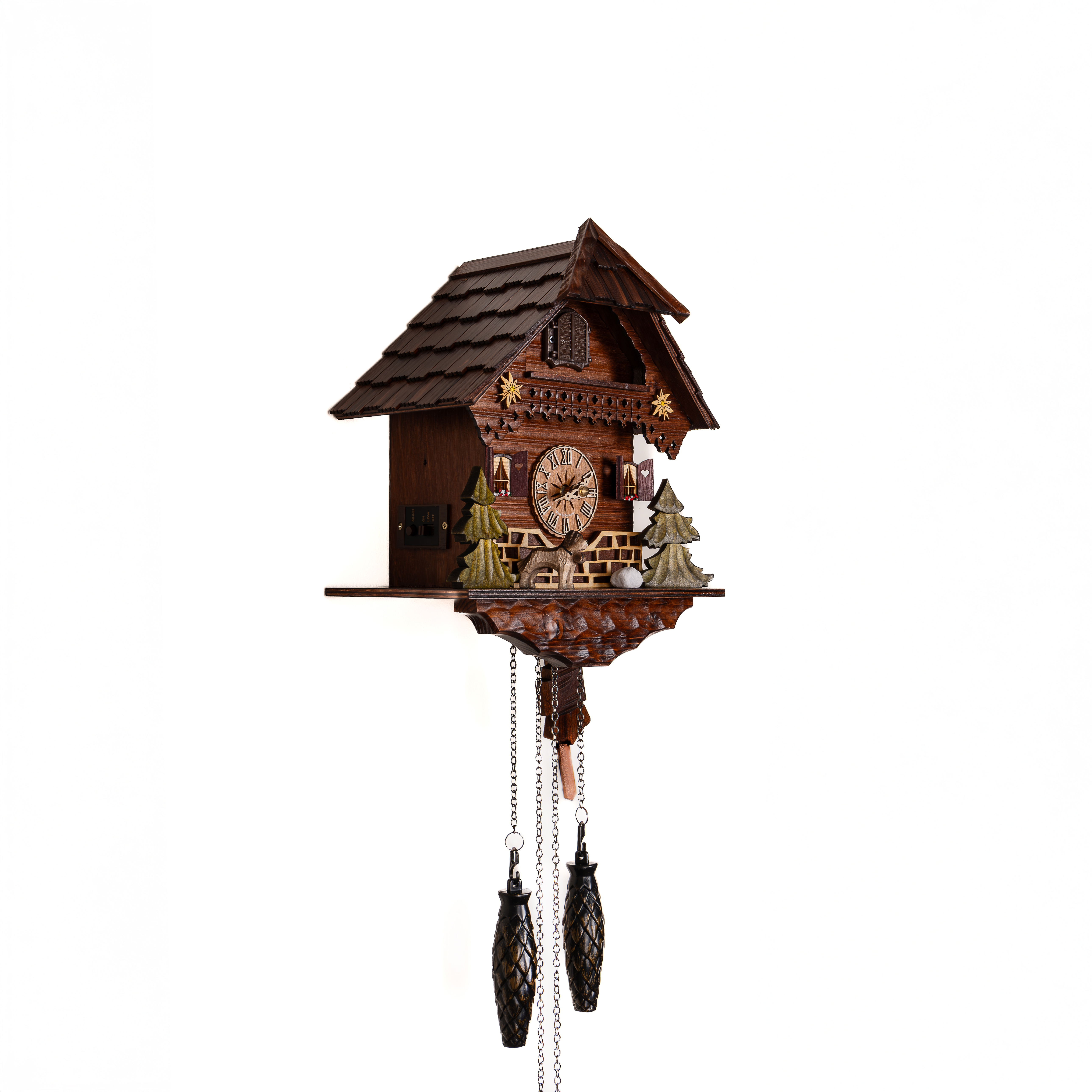 Механизм: Кварцевый. Декоративные маятник и гири. Кукушка кукует каждый полный час.