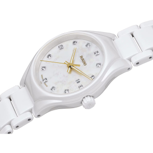 Корпус: Керамический корпус белого цвета, сапфировое стекло. Белый циферблат украшен бриллиантами в количестве 12 шт. Водонепроницаемость 50 метров. Диаметр 30 мм.
