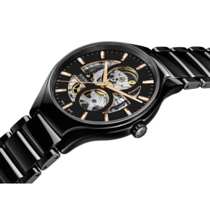 Корпус: Полированный чёрный высокотехнологичный керамический моноблочный корпус. Часы имеют чёрный циферблат с солнечными лучами со скосами цвета розового золота и серую печатную минутную шкалу. Стрелки и часовые индексы позолоченные с люминесцентным покрытием по технологии SuperLumiNova®. Сапфировое стекло имеет антибликовое покрытие, уменьшающее отражение света для лучшей читаемости показателей. Прозрачная задняя крышка из сапфирового стекла и титана. Диаметр 40 мм. Водостойкость 50 м.