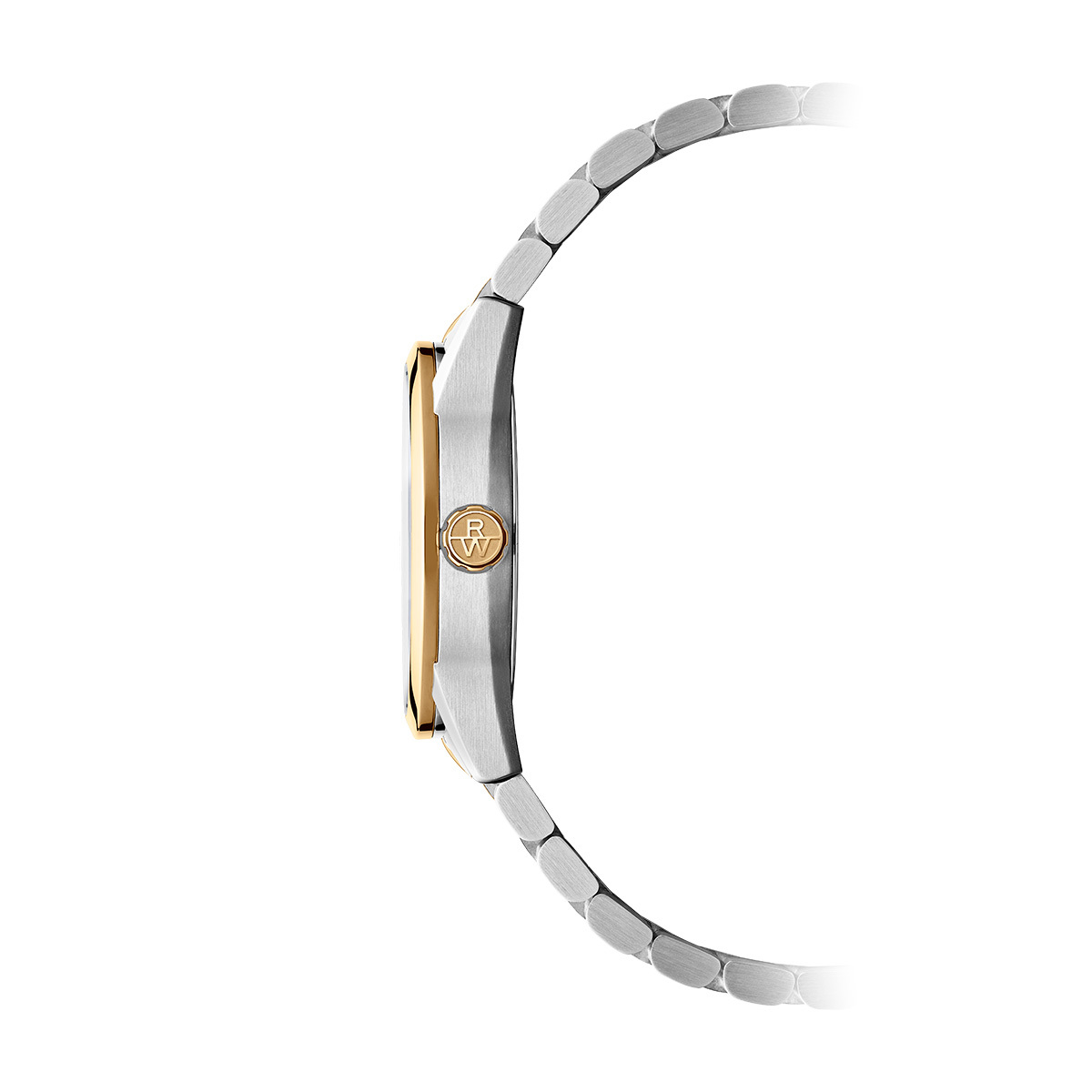 Ремешок: Браслет из высококачественной стали с 5 рядами литых звеньев, центральный ряд звеньев с золотым покрытием. Браслетная застежка, раскладывающаяся при нажатии на кнопки с двойной системой блокировки, украшена гравировкой Raymond Weil.