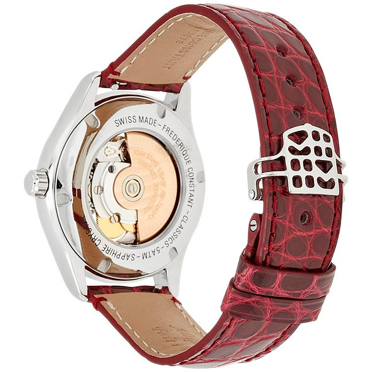 Ремешок: Ремешок цвета бургунди из высококачественной кожи аллигатора. Пружинная система быстрой смены ремешка. Классическая застежка - пряжка из нержавеющей стали украшена гравировкой с эмблемой марки.