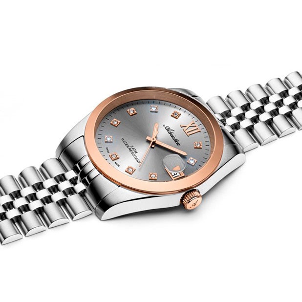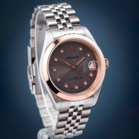 Корпус: Круглый корпус выполнен из полированной нержавеющей стали с частичным PVD покрытием розового золота. Циферблат с метками в виде точек из фианитов и римской цифры 12 выполнен по технологии Sunray (солнечные лучи). Стрелки с покрытием SuperLuminova, которое обеспечивает длительную подсветку в темное время суток. Минеральное стекло с сапфировым покрытием. Рифленая заводная головка. Диаметр корпуса составляет 36 мм, толщина 9 мм. Водостойкость WR 50 (мытье рук, дождь).
