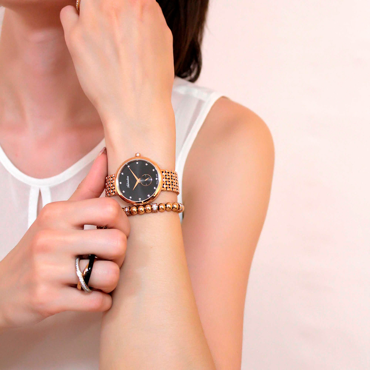 Корпус: Круглый корпус выполнен из полированной нержавеющей стали с розовым PVD покрытием золотом. Чёрный циферблат выполнен по технологии Sunray (солнечные лучи) и украшен 12 кристаллами. Накладные часовые индексы и стрелки выполнены из позолоченной стали. Минеральное стекло. Диаметр корпуса составляет 34 мм, толщина 7 мм. Водостойкость WR 30 (мытье рук, дождь).