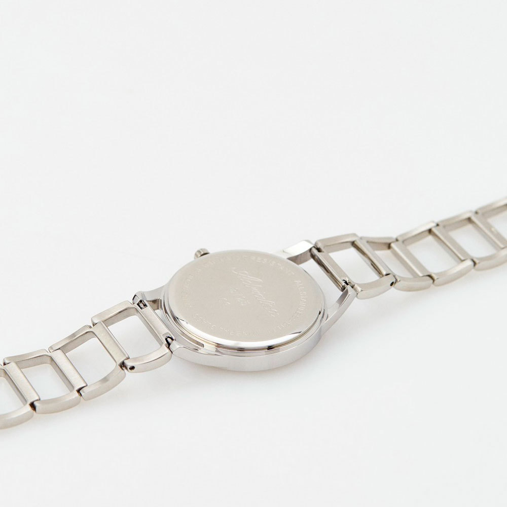Корпус: Круглый корпус выполнен из полированной нержавеющей стали. Перламутровый белый циферблат украшен 12 фианитами. Минеральное стекло устойчивое к появлению царапин, обладает высокой прозрачностью. Диаметр корпуса составляет 34 мм, толщина 7 мм. Водостойкость WR 30 (мытье рук, дождь).