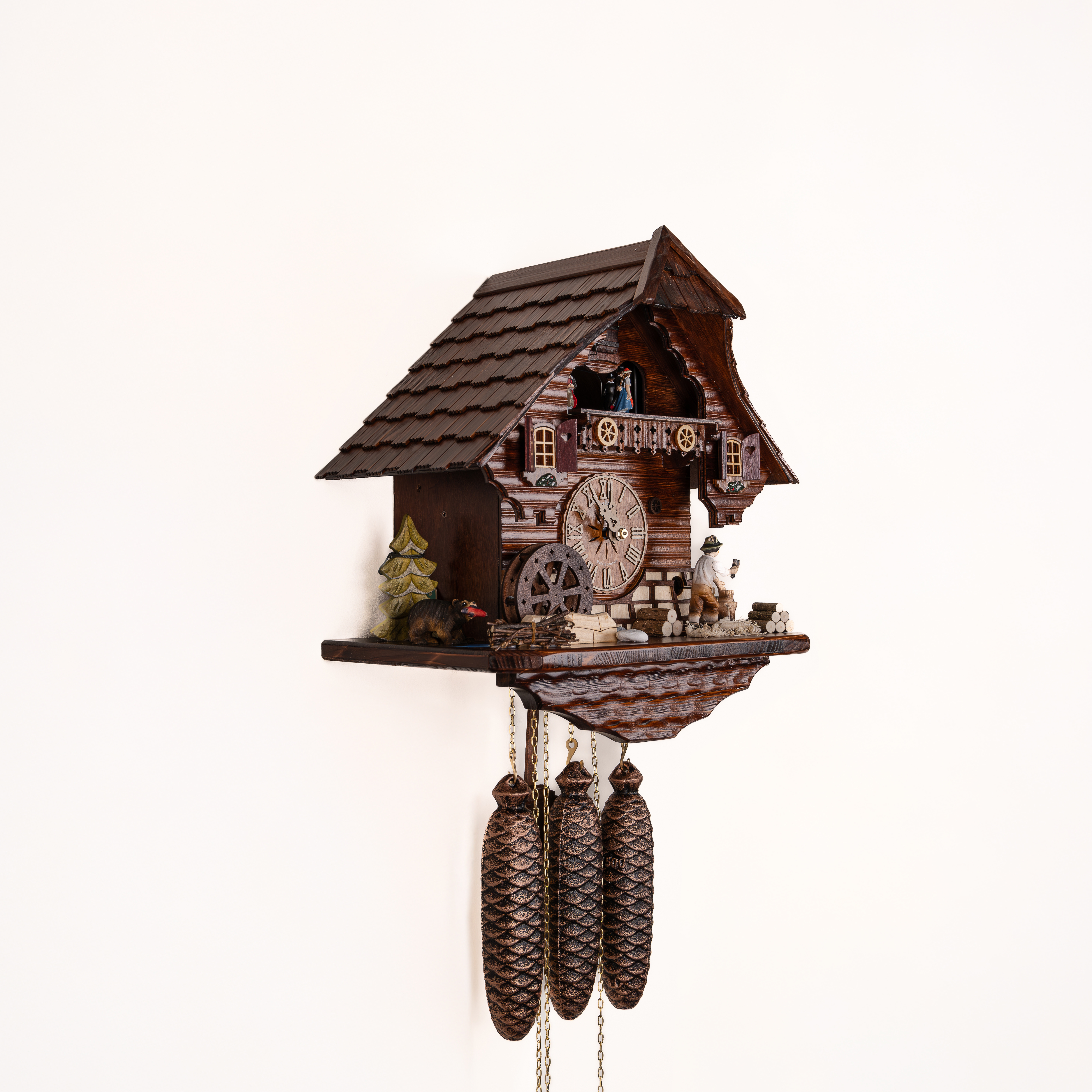 Материал: Натуральное дерево. Дом в стиле Шале. Декоративная резьба. Деревянная черепица. Деревянный циферблат часов. Деревянная кукушка. Движущиеся элементы-танцоры, лесоруб и мельничное колесо.