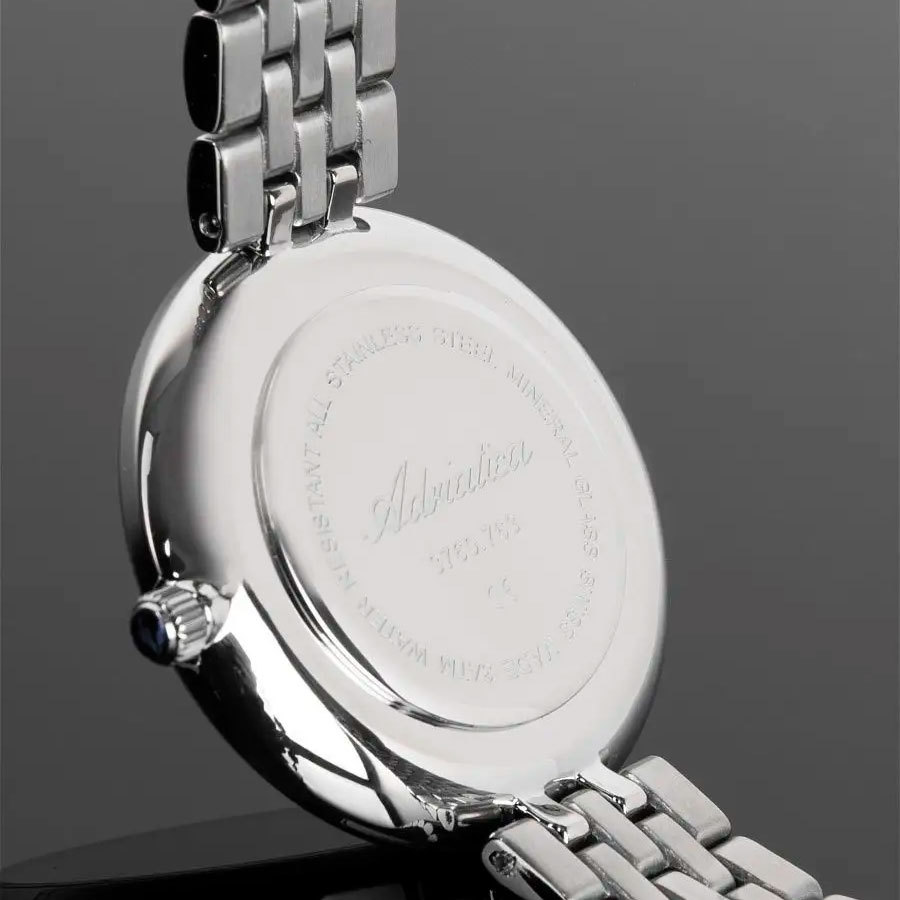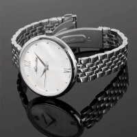 Корпус: Круглый корпус выполнен из полированной нержавеющей стали. Белый перламутровый циферблат. Накладные часовые метки и стрелки выполнены из стали. Минеральное стекло. Диаметр корпуса составляет 36 мм, толщина 8 мм. Водостойкость WR 30 (мытье рук, дождь).