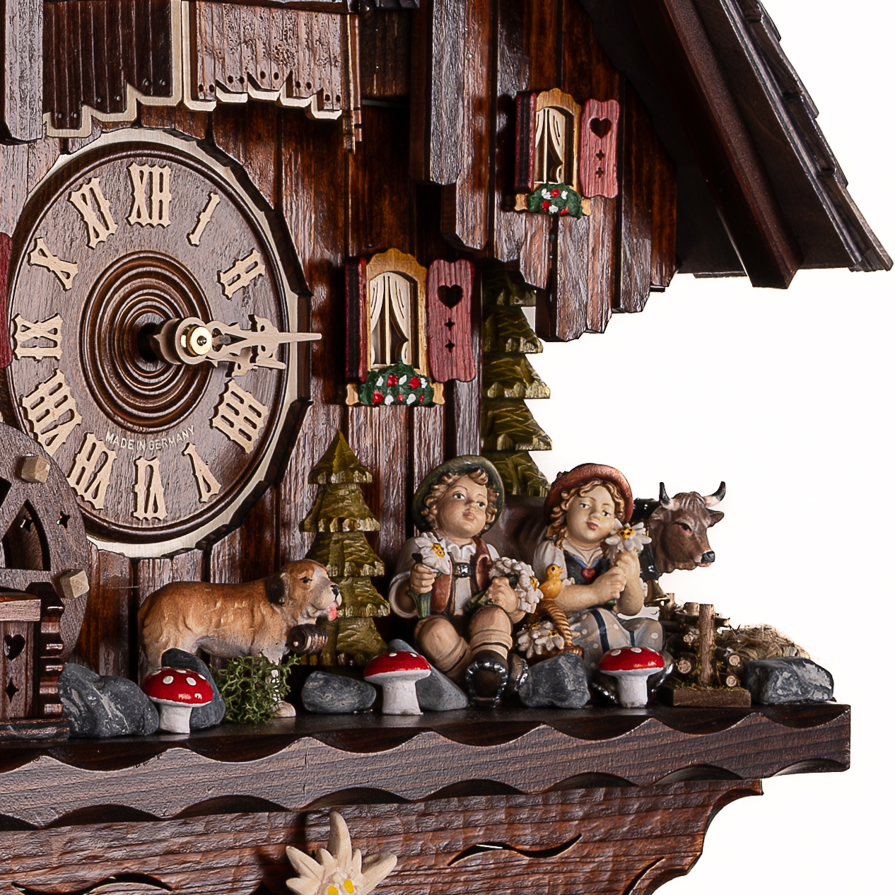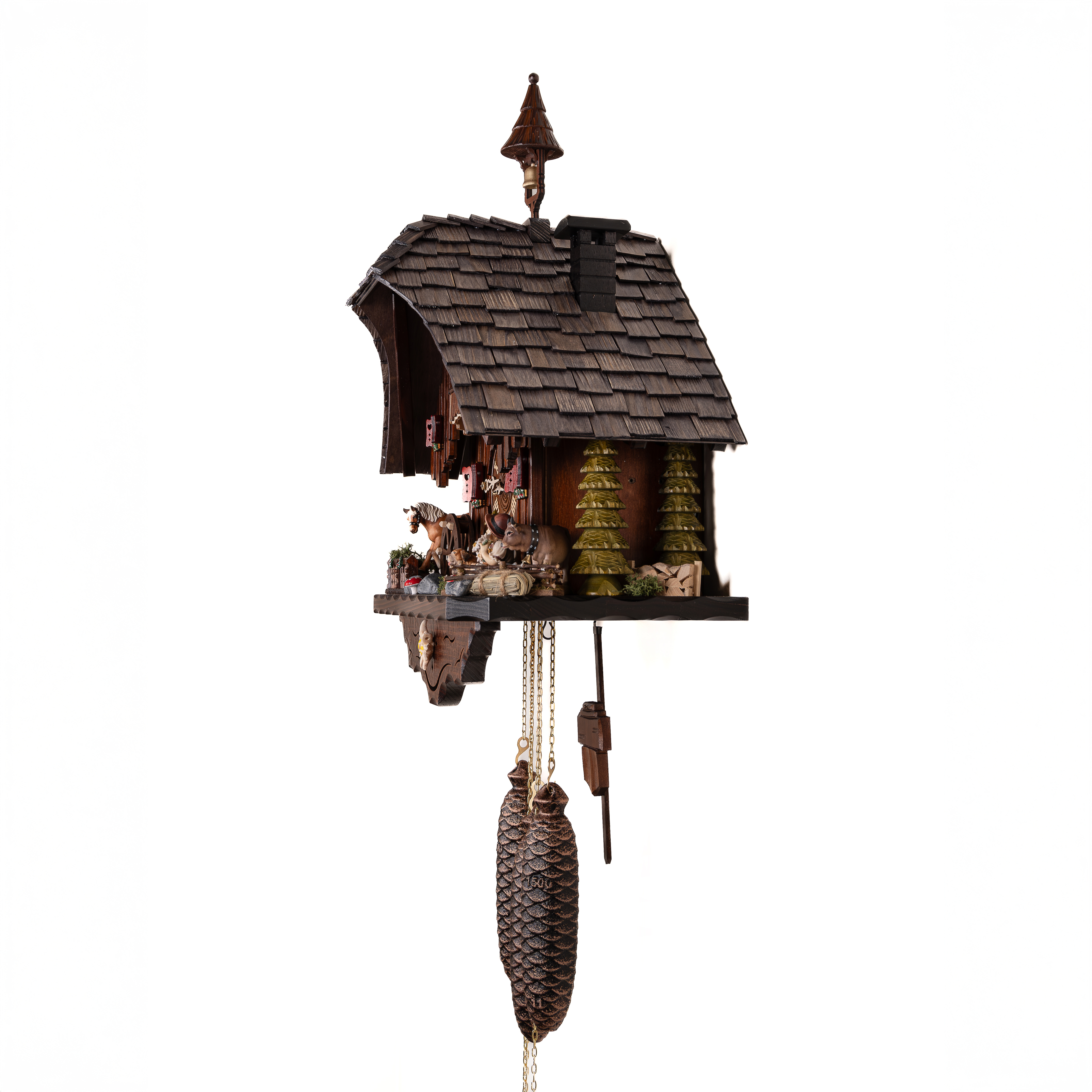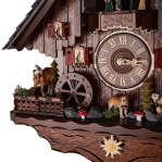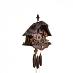 Механизм: Механические часы с кукушкой, которые работают от гирь на цепной тяге. Сделан на фирме SBS-Feintechnik GmbH & Co. KG Германия. Шварцвальдский дом с танцующими парами на балконе. Запас хода на 8 дней. Ручное отключение звука. В каждые пол часа кукушка появляется из своего домика, наклоняется и воспроизводит звук кукушки (ку-ку) один раз, в каждый полный час она кукует столько раз сколько показывают стрелки на часах. После этого на балкончике начинают кружиться в танце деревянные фигурки под музыку (2 мелодии чередуются). Одна гиря в данных часах отвечает за ход часового механизма, вторая за механизм кукушки, а третья за воспроизведение музыки, как в музыкальной шкатулке и движение танцующих фигурок на балконе.