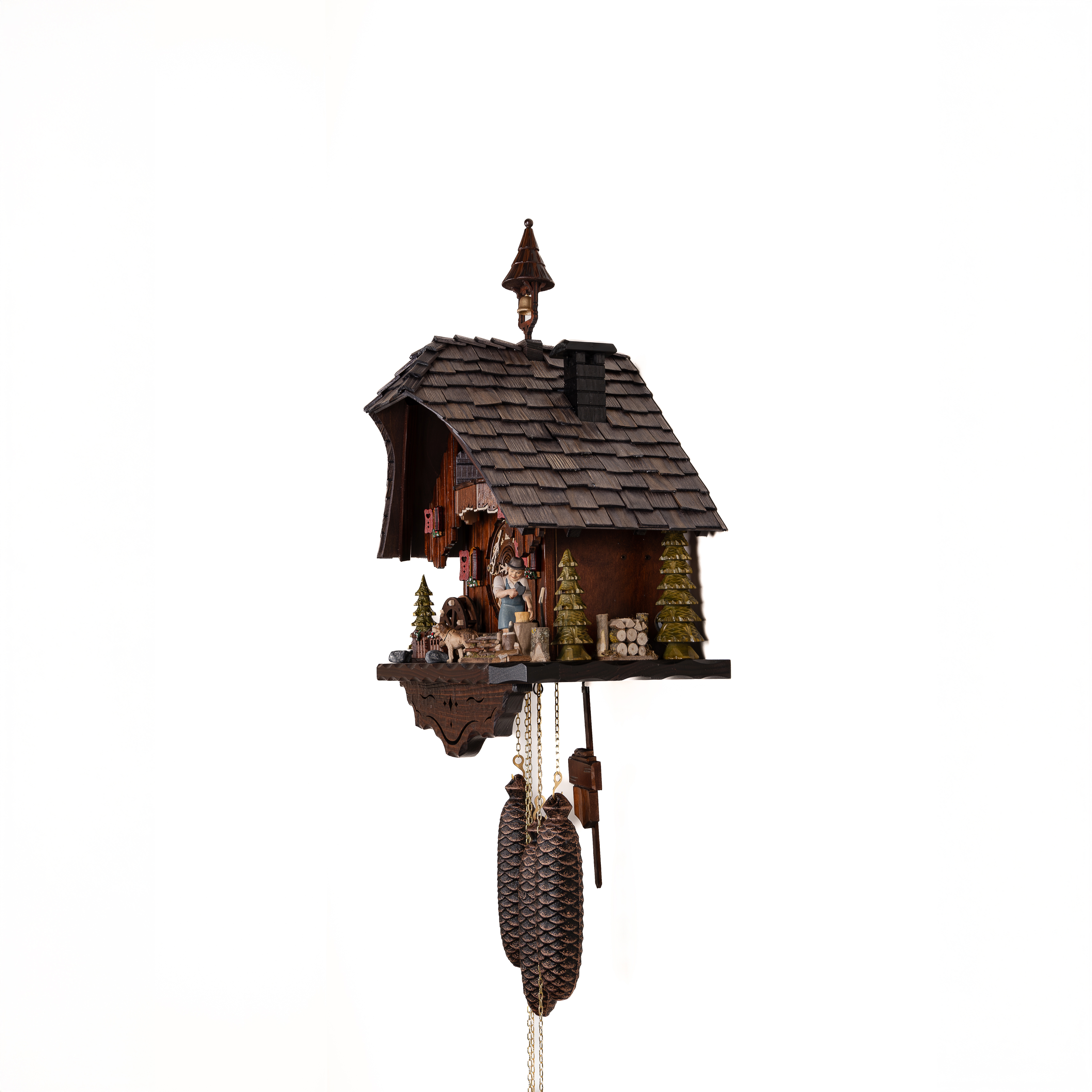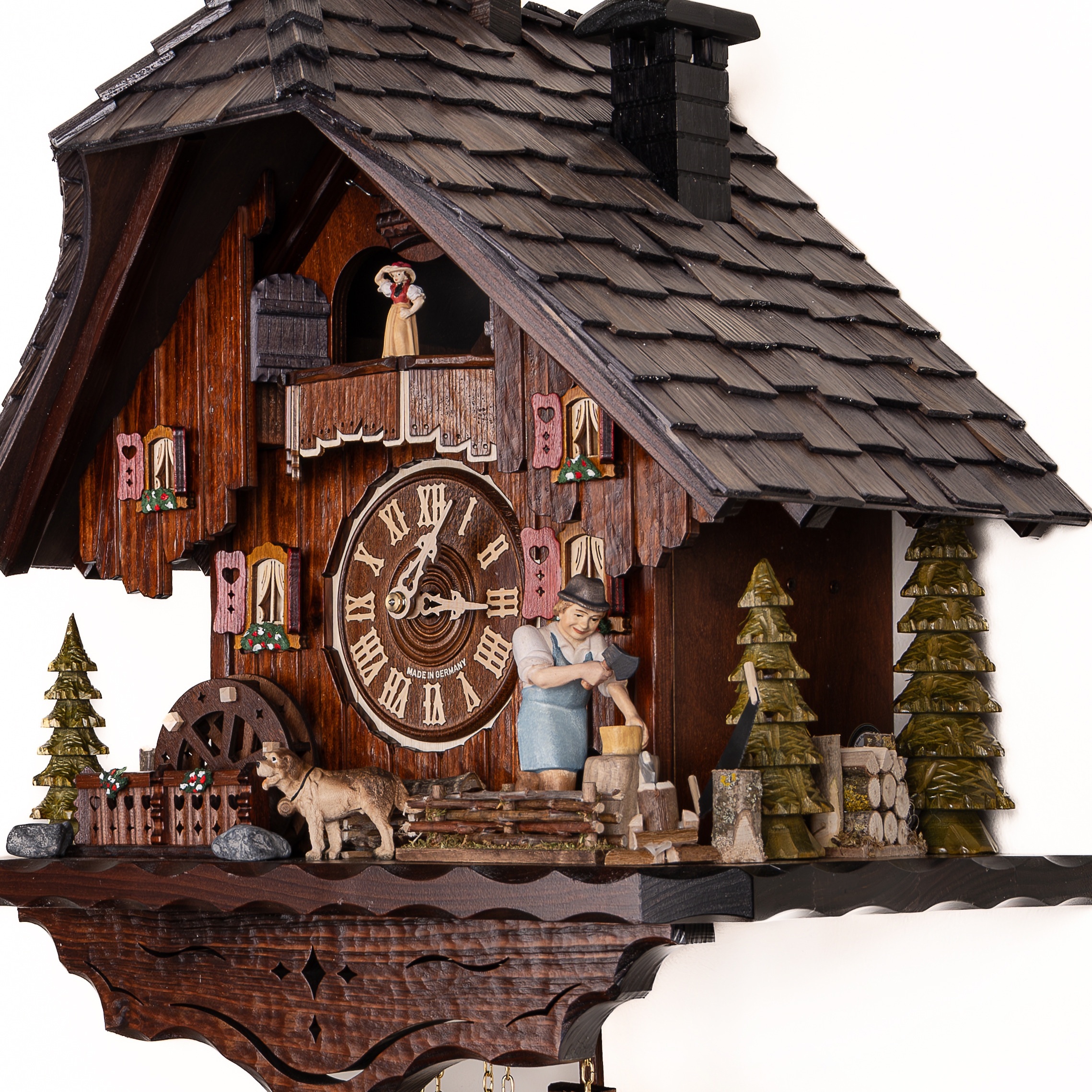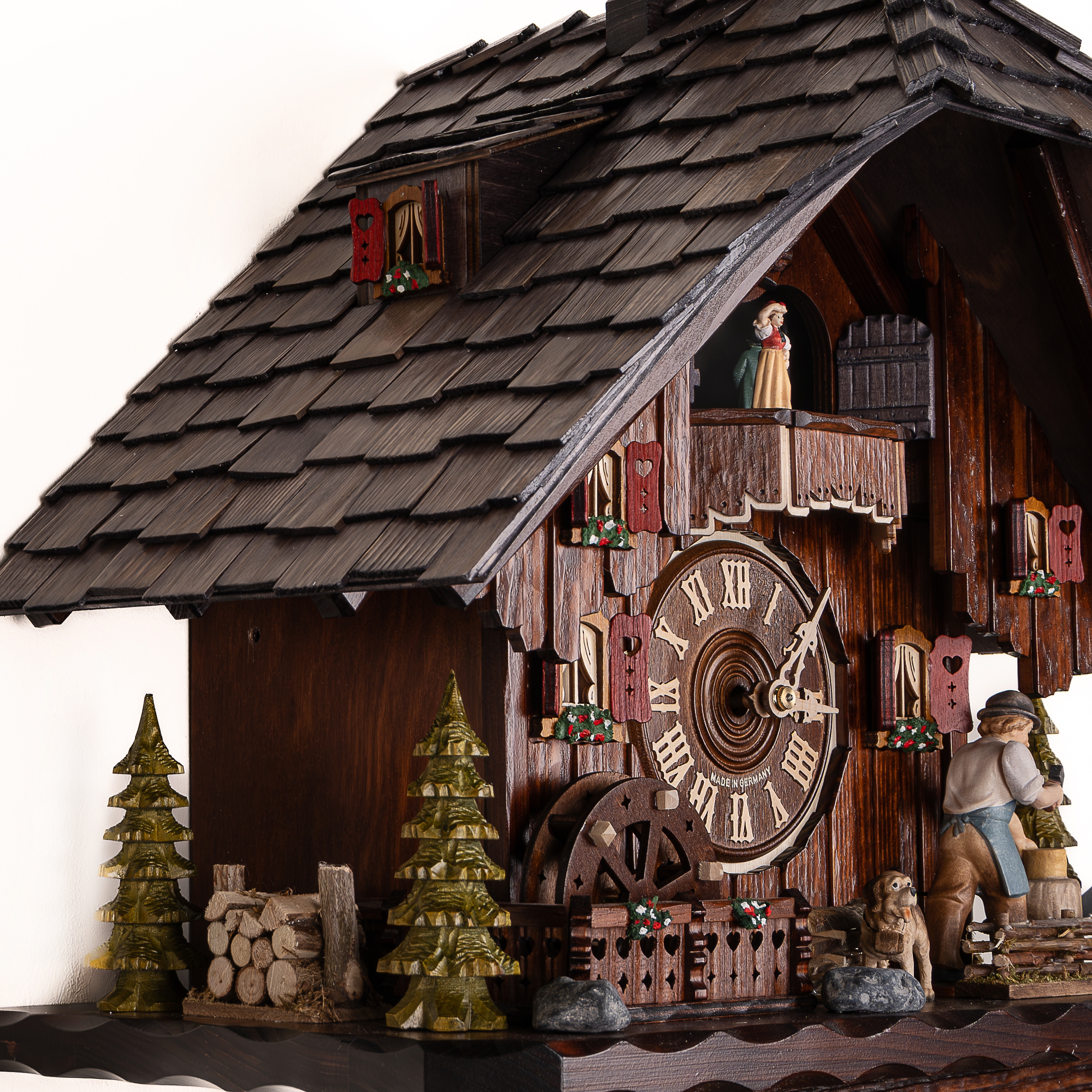 Механизм: Механические часы с кукушкой, которые работают от гирь на цепной тяге. Сделан механизм на фирме SBS-Feintechnik GmbH & Co. KG Германия. Шварцвальдский дом с подвижным дровосеком, мельничным колесом и танцующими парами на балконе. Запас хода на 8 дней. Ручное отключение звука. В каждые пол часа кукушка появляется из своего домика, наклоняется и воспроизводит звук кукушки (ку-ку) один раз, в каждый полный час она кукует столько раз сколько показывают стрелки на часах. После этого на балкончике начинают кружиться в танце деревянные фигурки под музыку (2 мелодии чередуются). Одна гиря в данных часах отвечает за ход часового механизма, вторая за механизм кукушки, а третья за воспроизведение музыки, как в музыкальной шкатулке и движение танцующих фигурок на балконе.