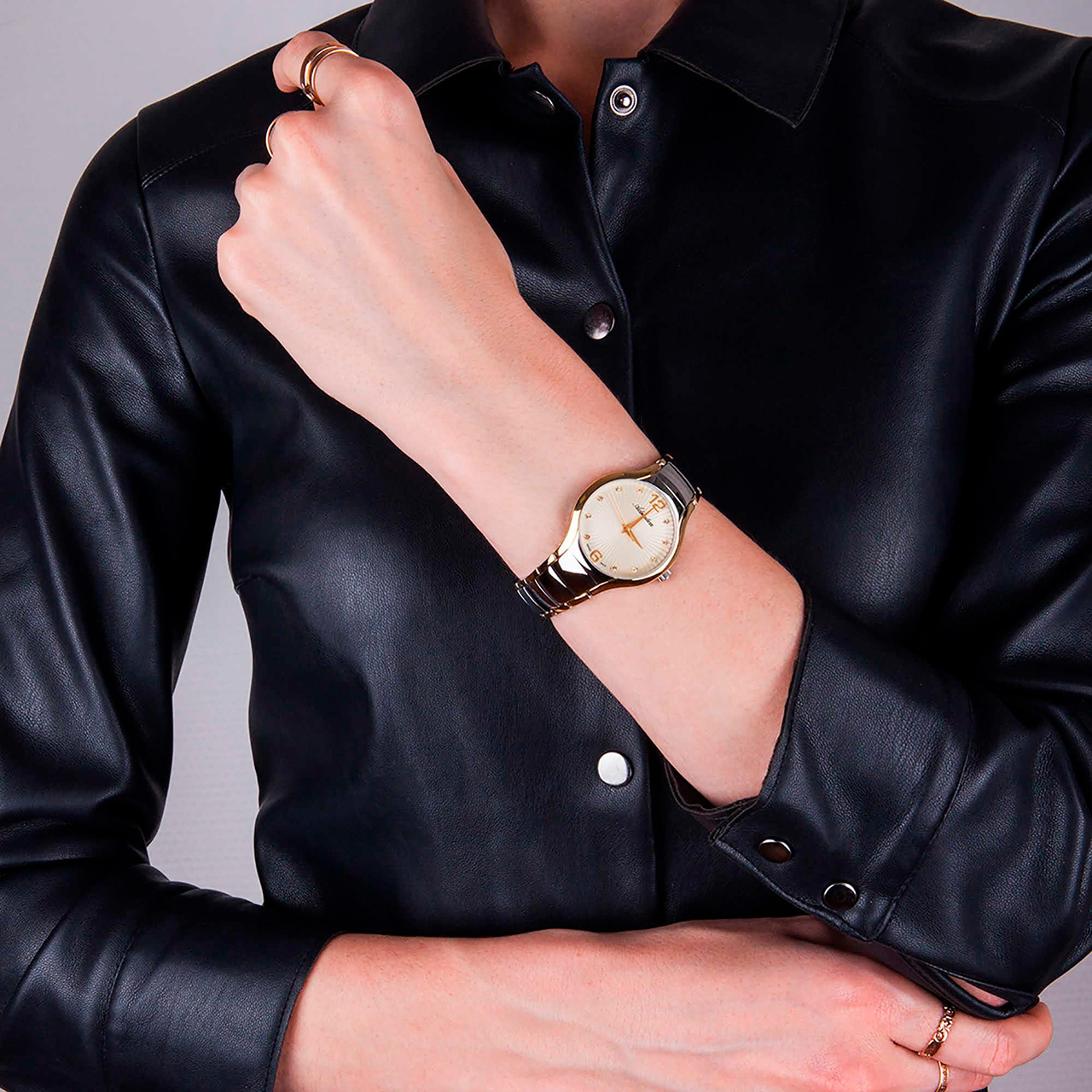 Корпус: Круглый корпус выполнен из полированной нержавеющей стали с PVD покрытием желтого золота. Циферблат цвета шампань украшен 10 цирконами. Минеральное стекло с сапфировым покрытием. Диаметр корпуса составляет 33 мм, толщина 7 мм. Водостойкость WR 30 (мытье рук, дождь).