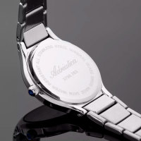 Корпус: Круглый корпус выполнен из полированной нержавеющей стали. Серебристый циферблат с узором гильоше, украшен 10 кристаллами. Накладные часовые индексы выполнены из стали. Минеральное стекло. Диаметр корпуса составляет 33 мм, толщина 7 мм. Водостойкость WR 30 (мытье рук, дождь).