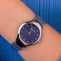 Корпус: Круглый корпус выполнен из полированной нержавеющей стали. Циферблат синего цвета украшен 10 цирконами. Сапфировое стекло, устойчивое к царапинам. Диаметр корпуса составляет 33 мм, толщина 7 мм. Водостойкость WR 30 (мытье рук, дождь).