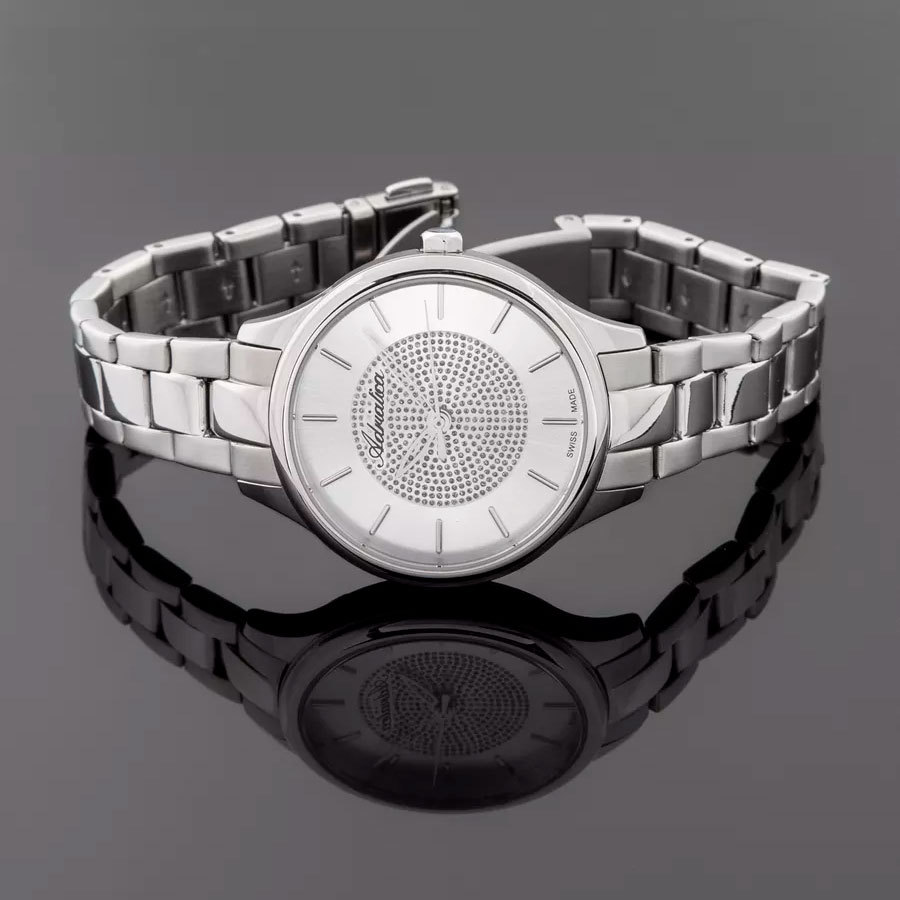 Корпус: Круглый корпус выполнен из полированной нержавеющей стали. Циферблат серебристого цвета с метками в виде штрихов, украшен фианитами. Минеральное стекло с сапфировым покрытием. Диаметр корпуса составляет 34 мм, толщина 8 мм. Водостойкость WR 30 (мытье рук, дождь).