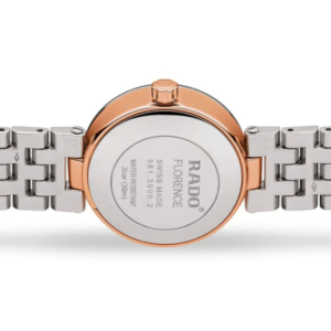 Корпус: Нержавеющая сталь с частичным PVD-покрытием розового золота. Металлик циферблат с золотистыми стрелками и часовыми индексами, декорирован 4 бриллиантами. Сапфировое стекло. Диаметр 28 мм. Водонепроницаемость 30 метров.
