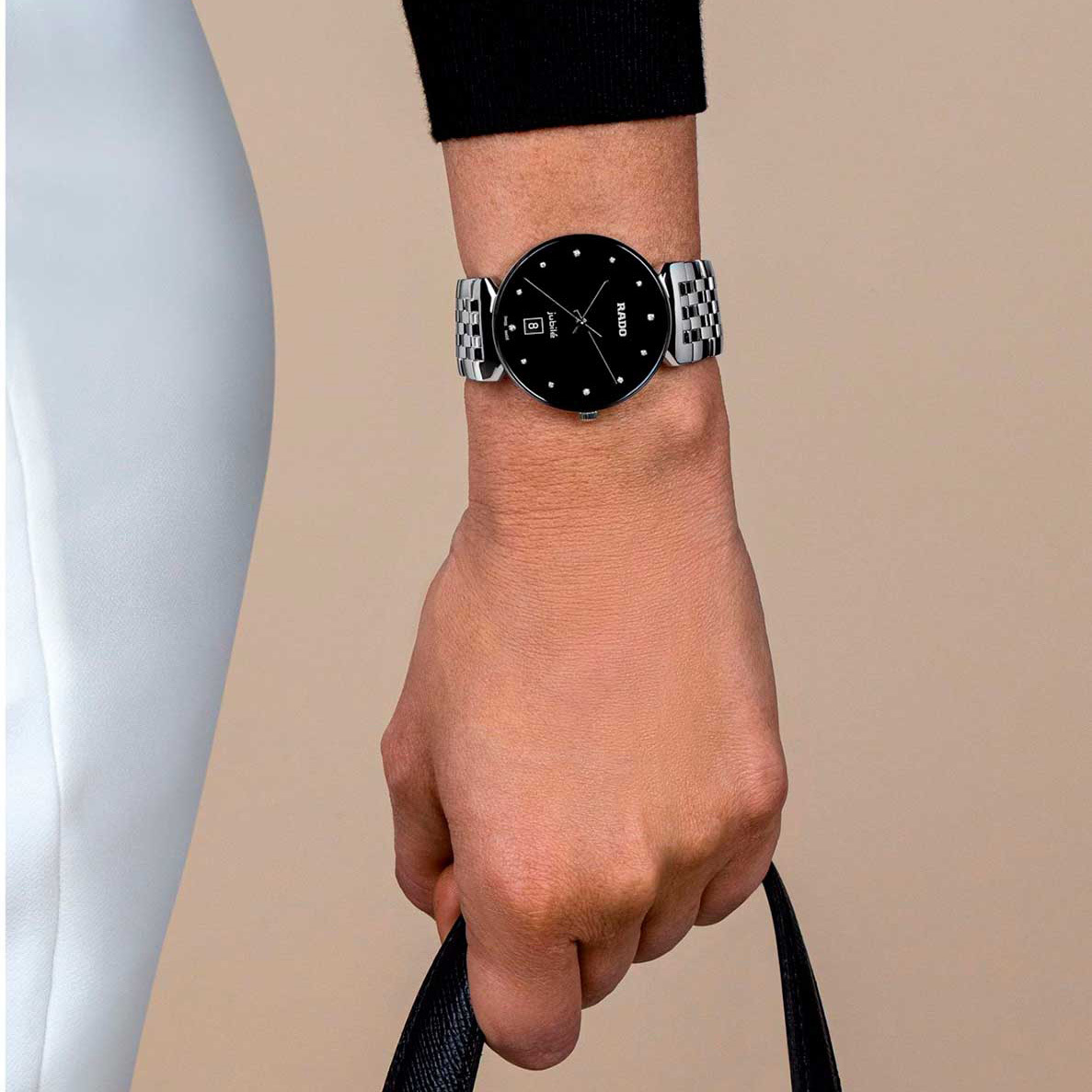Корпус: Корпус изготовлен из полированной нержавеющей стали 316L. Черный циферблат с 12 бриллиантами (4 бриллиантами - 0.032 ct. и 8 бриллиантами - 0.030 ct), украшенный логотипом «jubilé», идеально сочетается с стрелками, покрытыми родием в стиле Baton. Часы оснащены изогнутым сапфировым стеклом со скошенными краями. Рифленая заводная головка. Диаметр: 38 мм. Водостойкость: 50 м.