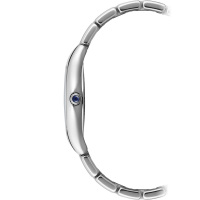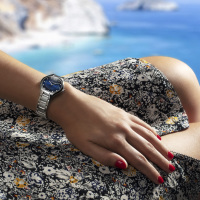 Корпус: Корпус с плавными линиями выполнен из нержавеющей стали марки 316L. Циферблат глубокого синего цвета с гильошированием и шлифовкой центральной части в стиле "солнечных лучей", 11 бриллиантов с круглой огранкой 8/8 - SI2 - SI1 весом 0,058 карата в качестве часовых индексов, аппликация римских цифр и стрелки имеют покрытие родием. Сапфировое стекло имеет повышенную устойчивость к возникновению царапин. Переводная коронка украшена кабошоном синего цвета. Задняя крышка крепится к корпусу на 4 винта. Диаметр корпуса модели составляет 32 мм, толщина - 7.58 мм. Водостойкость 50 метров (165 ft / 5 АТМ).