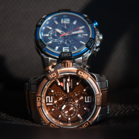 Корпус: Корпус выполнен из нержавеющей стали AISI 304, придающей часам особую прочность и стойкость от повреждений с часстичным покрытием IP(ионное). Его дополняет яркий рифленный безель с числовыми отметками. Часовые индексы и стрелки с покрытием SuperLuminova, которое обеспечивает подсветку в темное время суток. Циферблат коричневого цвета защищен упрочненным минеральным стеклом Hardlex(разработанным компанией Seiko Watch Corporation, которое обладает высокой устойчивостью к ударам и царапинам, около 7 баллов по шкале Мооса). Диаметр: 48 мм. Водонепроницаемость: 100 м.