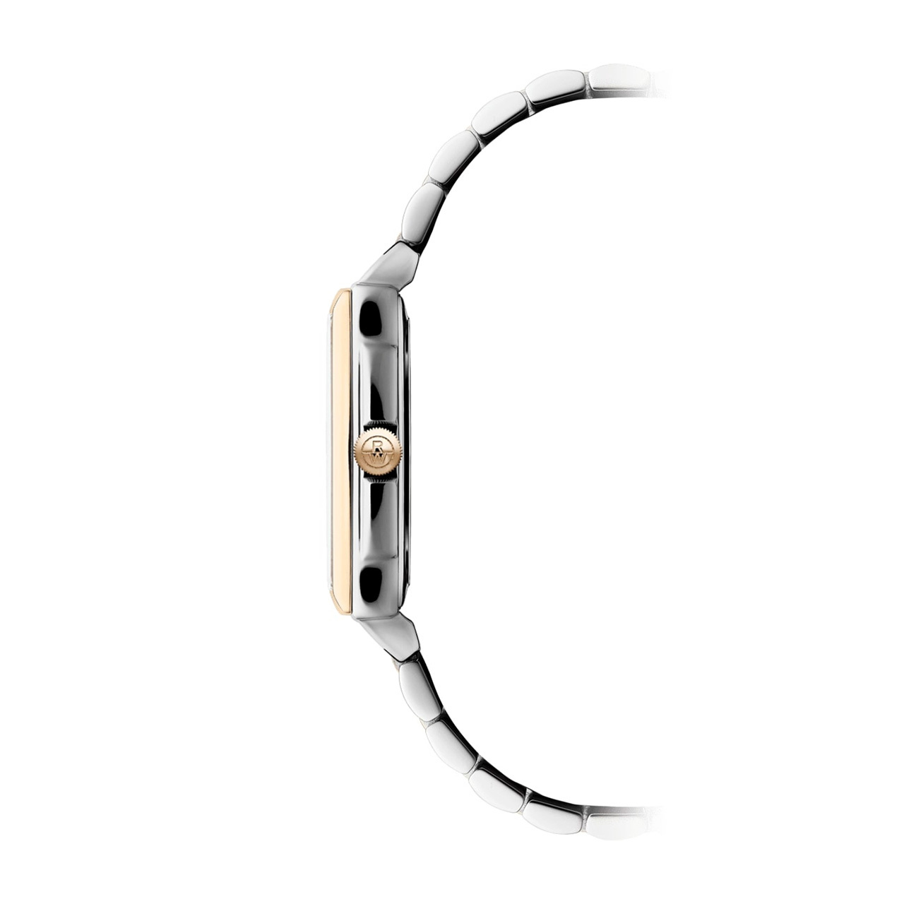 Корпус: Корпус прямоугольной формы выполнен из нержавеющей стали марки 316L, безель и переводная коронка с PVD покрытием цвета розового золота. Циферблат из натурального перламутра, аппликация римских цифр и граненые стрелки имеют покрытие золотом, циферблат украшен инкрустацией 8 бриллиантов 8/8 SI2 - SI1, весом 0,026 карата, в качестве часовых индексов. Сапфировое стекло имеет повышенную устойчивость к возникновению царапин. Водостойкость 50 метров. Корпус модели имеет размеры: 22,6 на 28,1 мм, толшина - 6,4 мм.