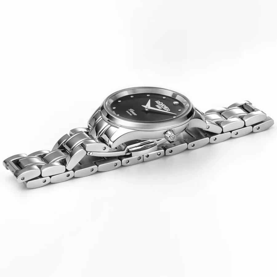Корпус: Корпус изготовлен из высококачественной нержавеющей стали, марки 316L. Чёрный перламутровый циферблат. Накладные точечные часовые индексы и стрелки выполнены из полированной стали. На каждом циферблате в положении «12 часов» расположен уникальный бриллиант. Сапфировое стекло с антибликовым покрытием защищает циферблат от царапин и обеспечивает отличную читаемость при любом освещении. Рифлёная заводная головка. Диаметр: 30 мм. Водонепроницаемость: 50 метров.