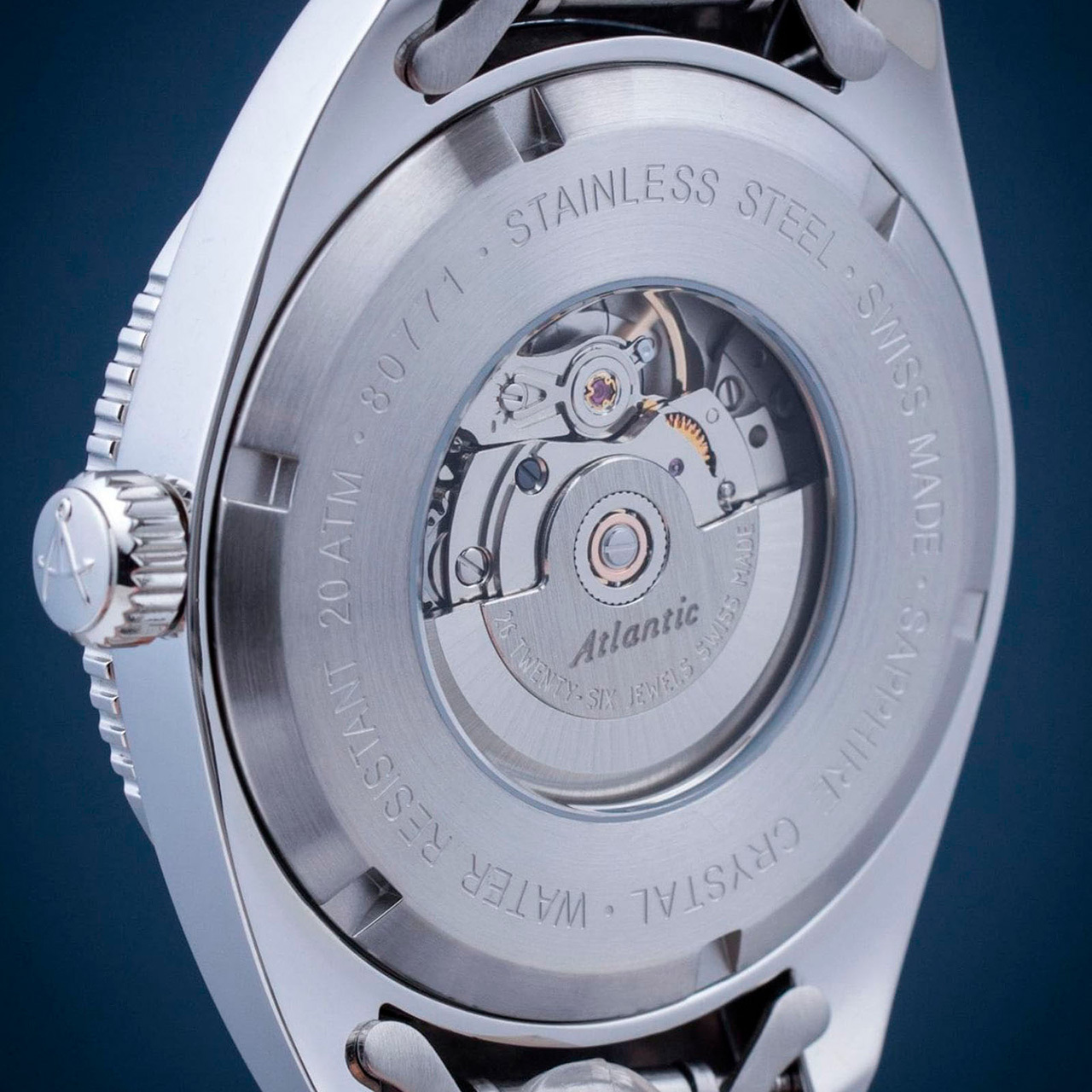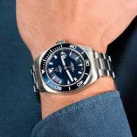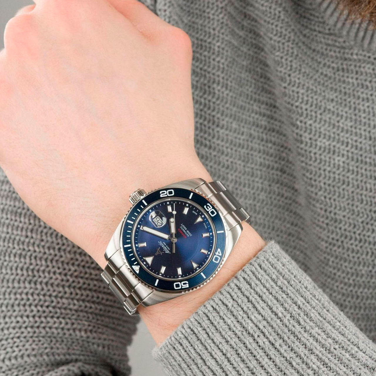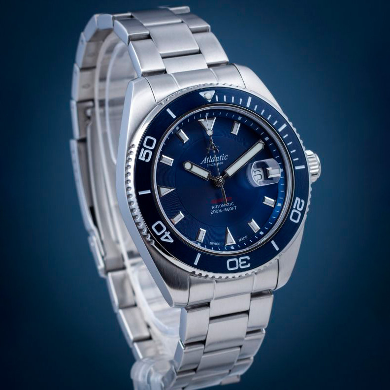 Корпус: Корпус из нержавеющей стали. Синий циферблат. Сапфировое стекло, люминесцентное покрытие стрелок и часовых индексов. Завинчивающиеся задняя крышка и заводная головка. Однонаправленно вращающийся безель. Диаметр 44 мм., водонепроницаемость 200 метров.