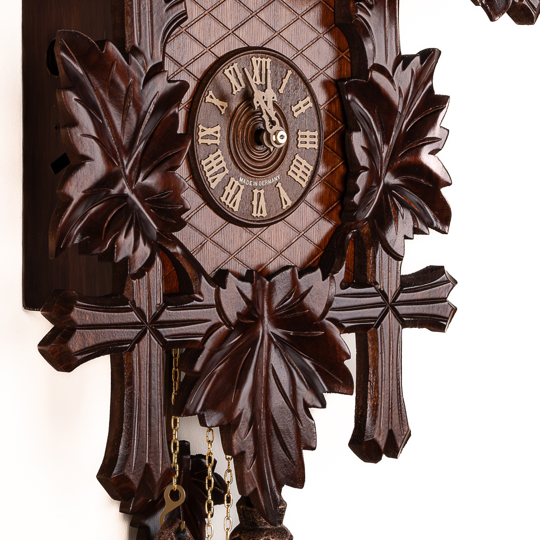 Механизм: Механические часы с кукушкой, которые работают от гирь на цепной тяге. Сделан на фирме SBS-Feintechnik GmbH & Co. KG Германия. Запас хода на 8 дней. Ручное отключение звука. В каждые пол часа кукушка появляется из своего домика, наклоняется и воспроизводит звук кукушки (ку-ку) один раз, в каждый полный час она кукует столько раз сколько показывают стрелки на часах. Одна гиря в данных часах отвечает за ход часового механизма, а вторая за механизм кукушки.