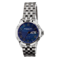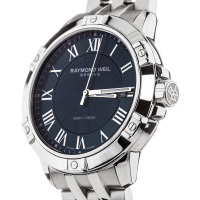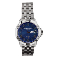 Корпус: Корпус из нержавеющей стали марки 316L с матовой шлифовкой и глянцевой полировкой. Переводная коронка с винтовой фиксацией украшена гравированным логотипом Raymond Weil. Рельефный безель с декоративными винтами имеет гравированную разметку. Циферблат синего цвета, центральная часть украшена гильошированием в стиле "капли воды". Римские цифры, стрелки имеют покрытие цвета родия. Светонакопительный состав на разметке циферблата и стрелках. Диаметр корпуса 41 мм, толщина 7,4 мм. Сапфировое стекло. Водостойкость 300 метров.